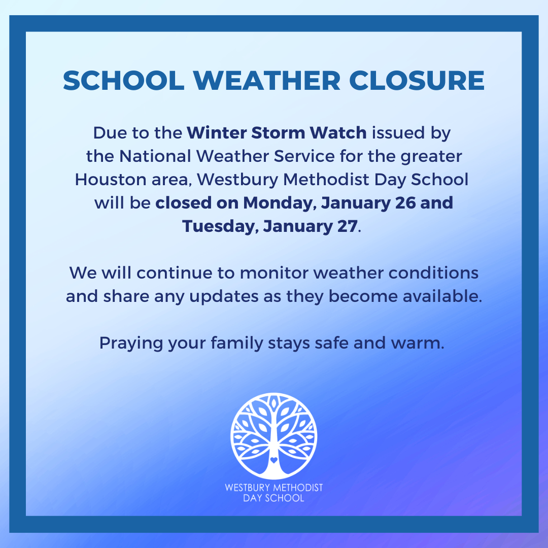Due to a Winter Storm Watch issued by the National Weather Service for the greater Houston area, Westbury Methodist Day School will be closed on Monday, January 26, 2026 and Tuesday, January 27, 2026.