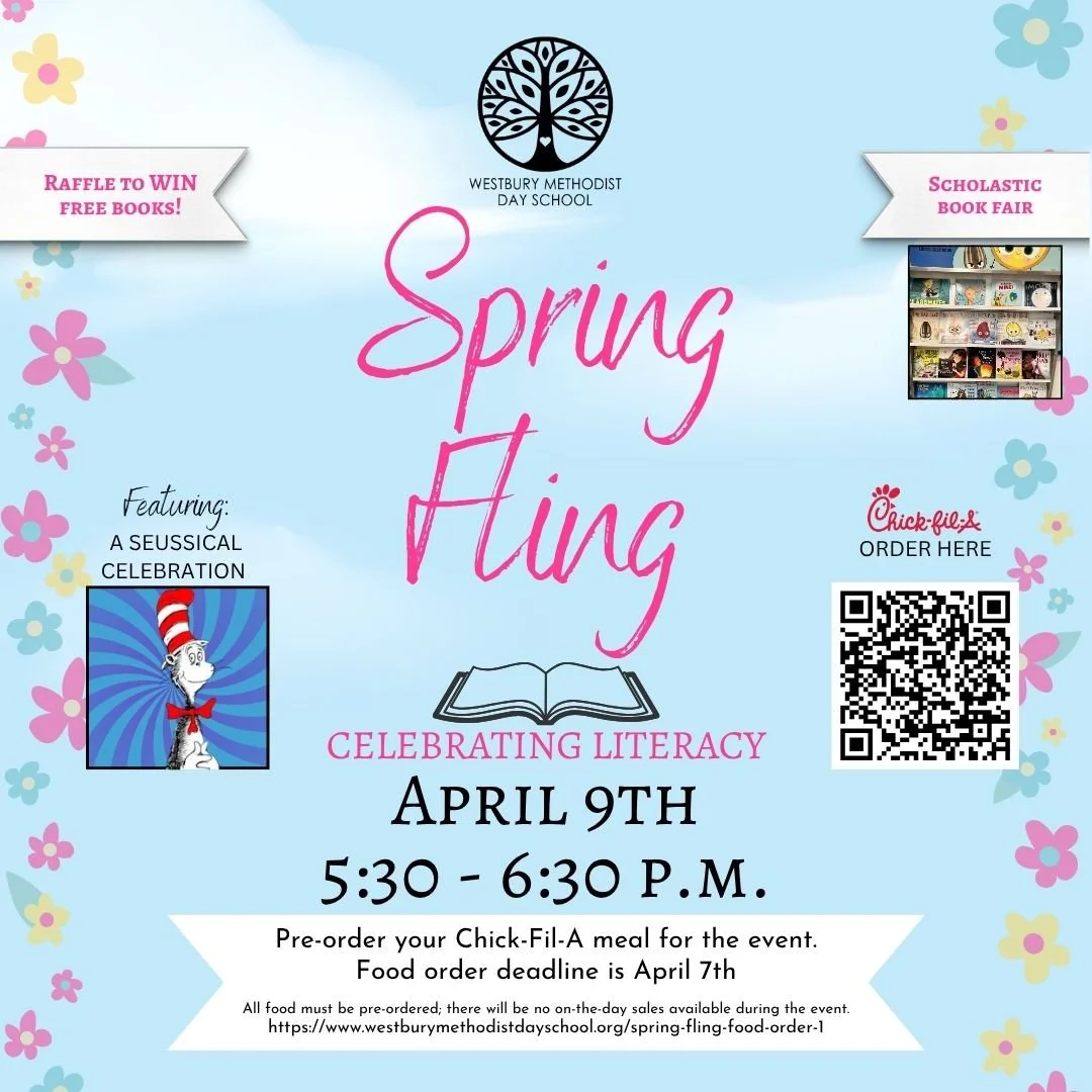 We can't wait to see you at Spring Fling this Thursday at 5:30 p.m.! Enjoy a fun Seussical Celebration storytime, play, eat, and hang out with school friends! Remember to place your food order today.